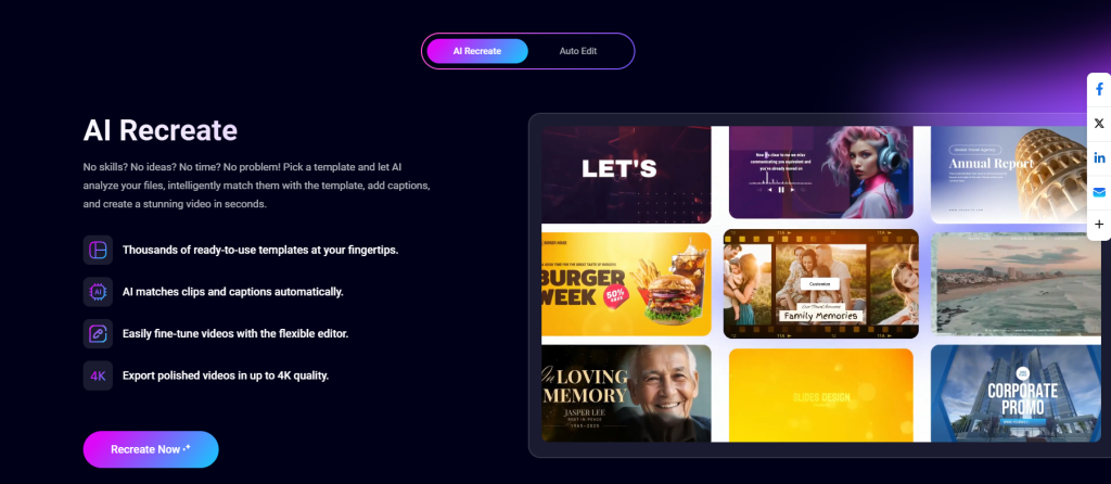 The real strength of these new features emerges when they are used together. For example, a user can first apply Auto Edit to assemble raw footage into a structured video. Then, they can leverage AI Recreate to produce multiple stylistic variations for different distribution needs—such as social media formats, branded versions, or thematic adaptations.